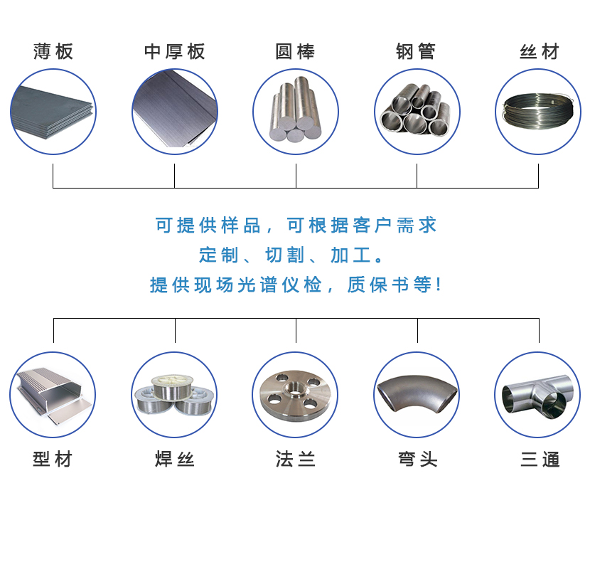熱扎棒15~100mm,鍛制棒:100mm~350mm,冷扎薄板0.05mm-4.0mm,熱扎板:4mm~14mm,帶2mm-10mm,各尺寸規格鍛件鍛件,庫存個別不定尺等。